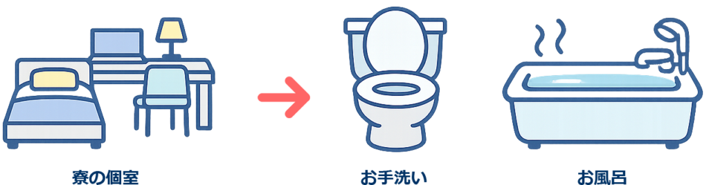 部屋が1人部屋でもトイレや風呂が共同の寮はあります。共同だと混雑時間が発生します。室内設備が整う寮もありますが通勤が伸びることもあるので一長一短です。