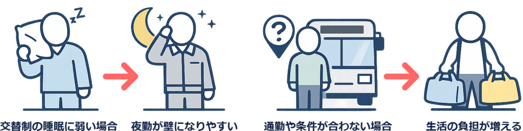 条件が合わないと続けるほど消耗します。交替制の睡眠に弱い場合は夜勤が壁になりやすいです。通勤や条件が合わない場合は生活の負担が先に来ます。合わない理由が健康や家庭事情なら別の求人情報を優先するほうが現実的です。
